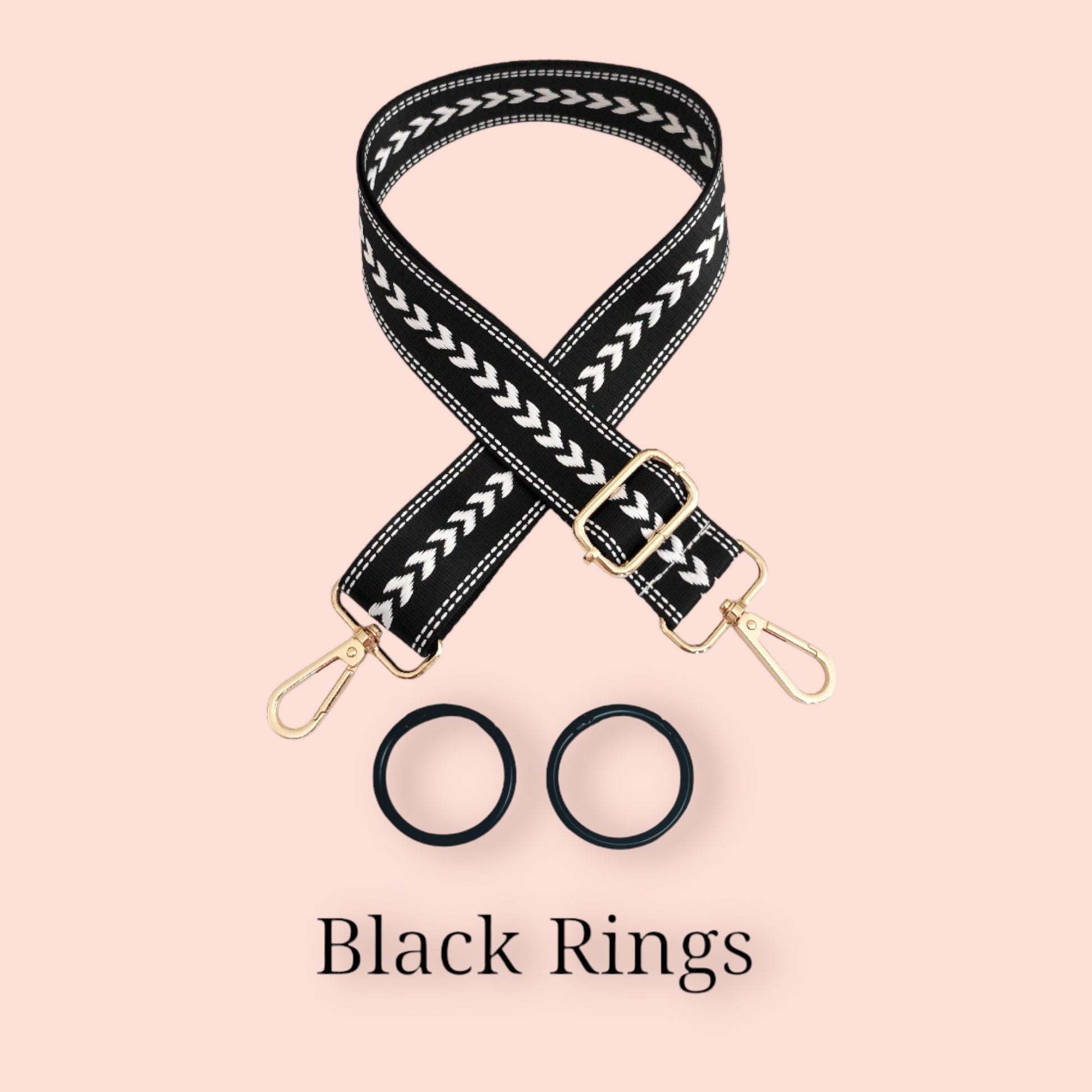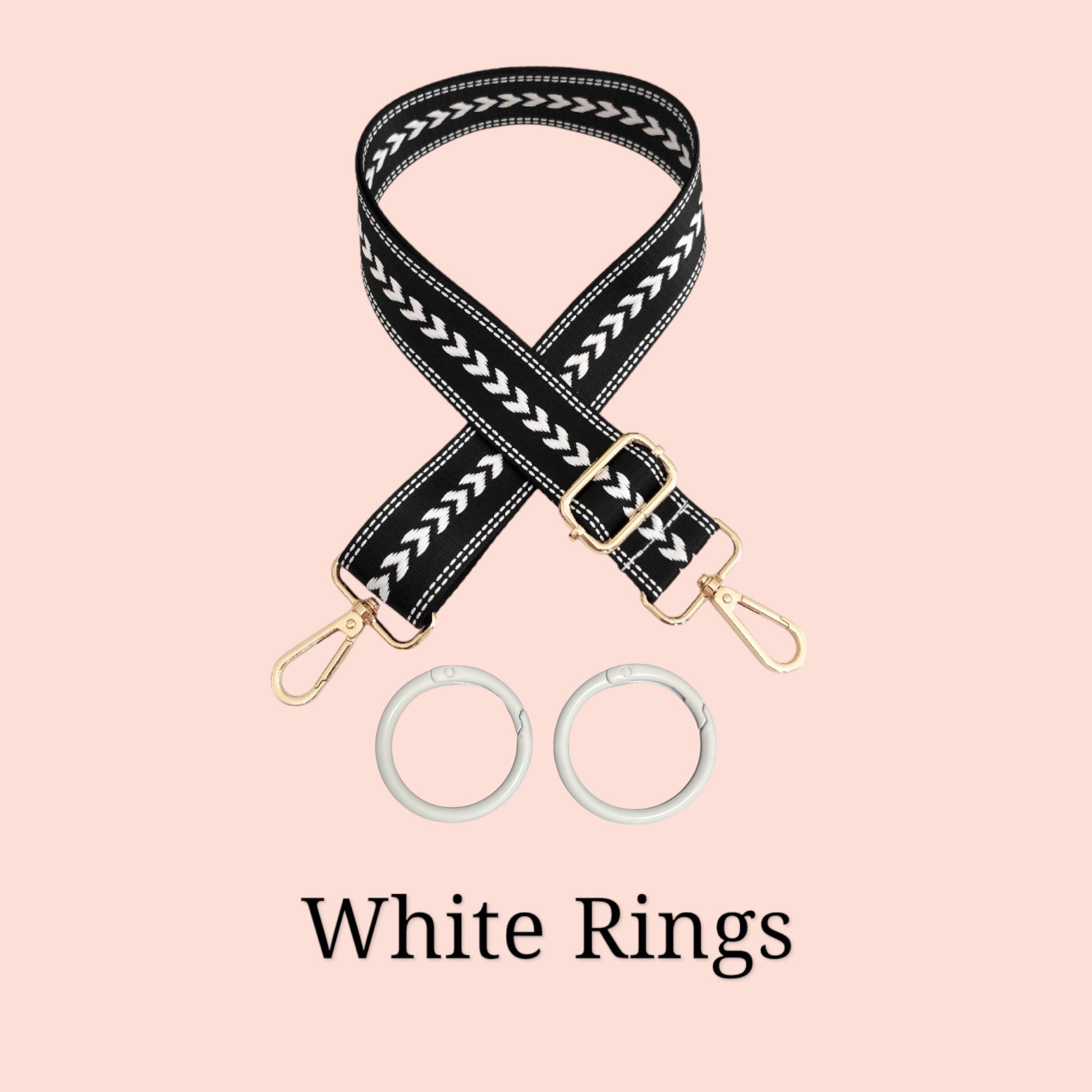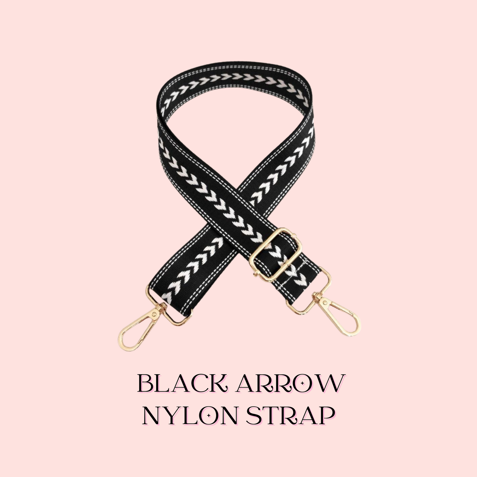 Black Arrown Nylon with white arrow design. Gold hardware. Adjustable length of 80-130 cm. Ring included. (BAG NOT INCLUDED)