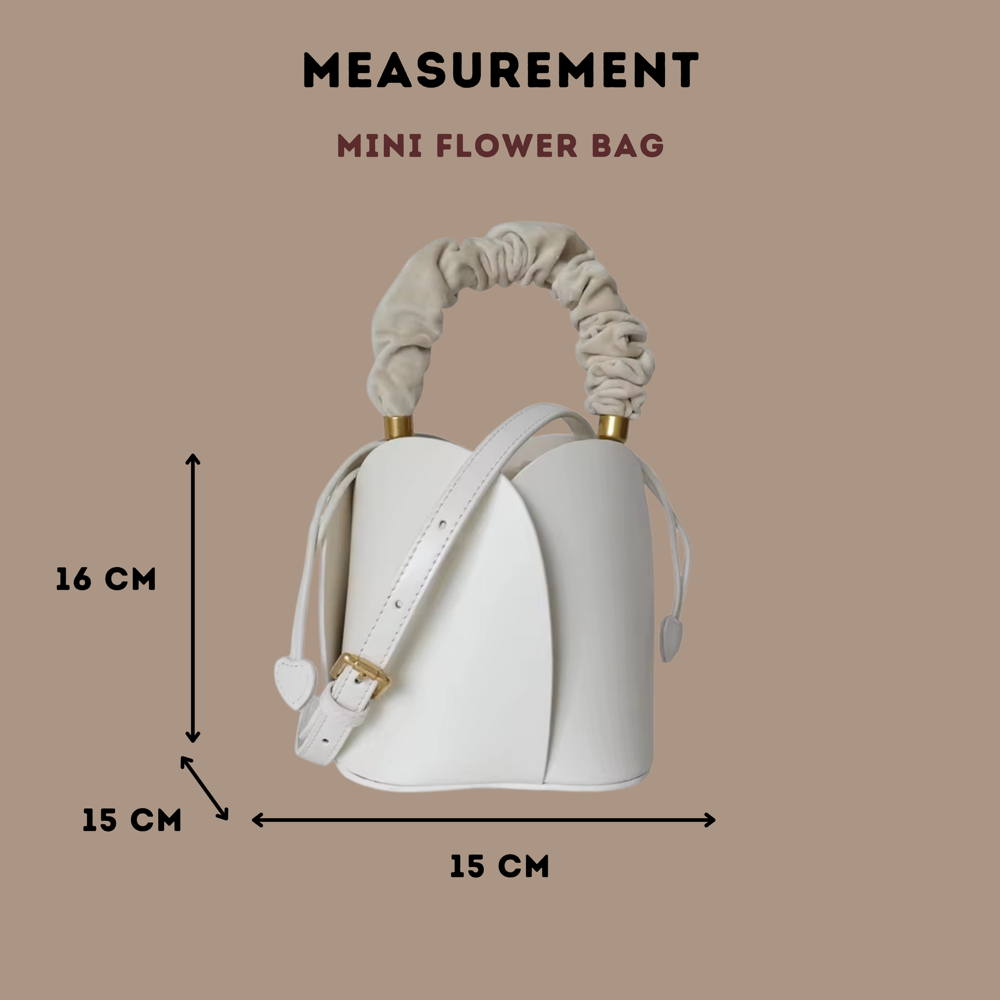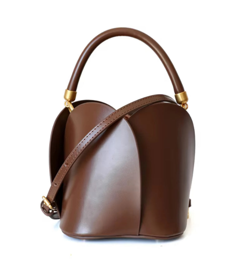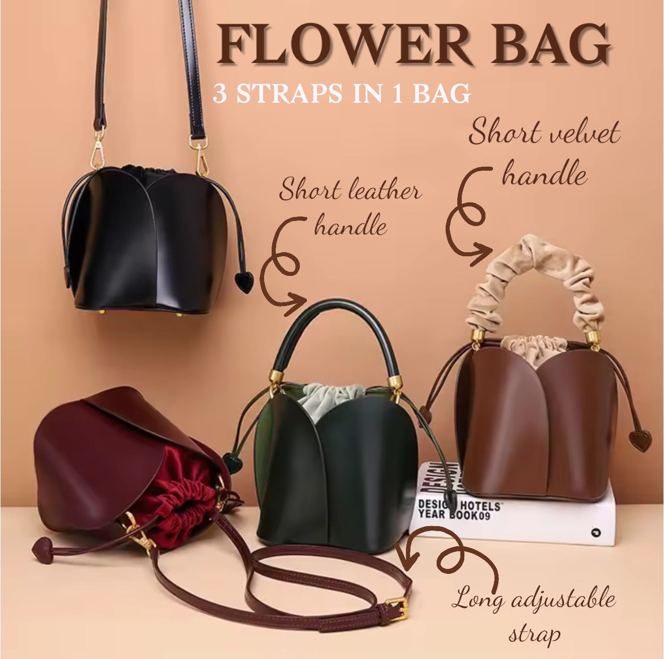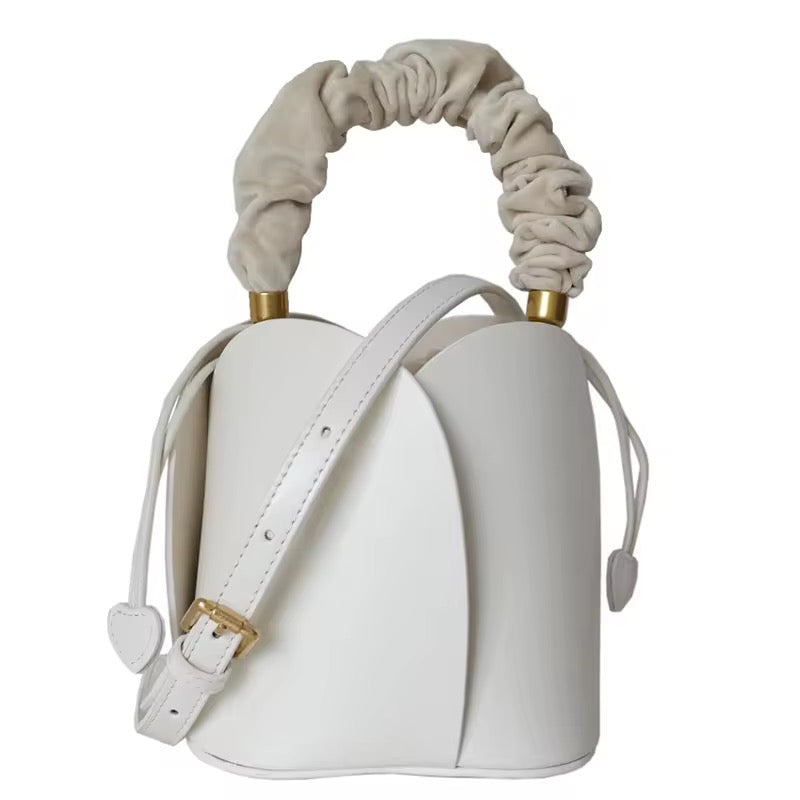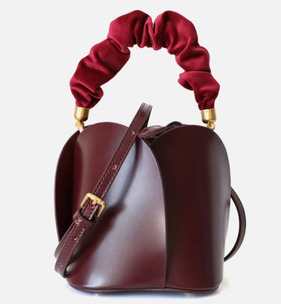 Mini Flower Bag is made of genuine cowhide leather. It comes with a 3- option strap; short velvet handle, short leather handle and long adjustable strap.