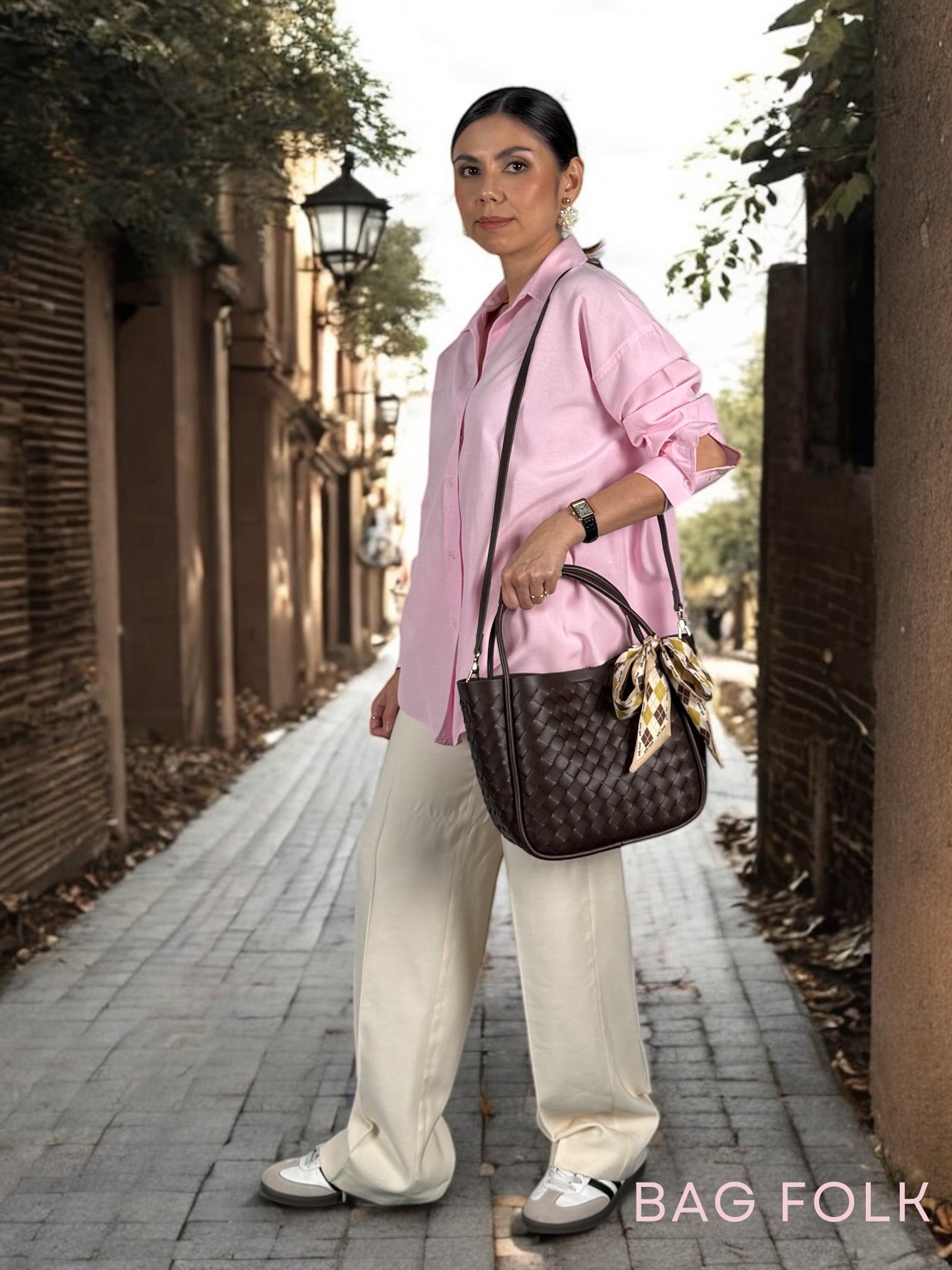 JIANA BAG IS MADE OF GENUINE LEATHER WITH HAND WOVEN DESIGN. IT CAN BE USED AS A HANDBAG OR A SLING BAG.